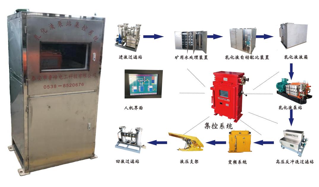 矿山井下乳化液泵站基本上属于24h运行制,在实际生产中乳化液泵站的耗能有60%是无用功。根据理论计算及实践证明,仅乳化液泵站进行变频节能改造一项,节能率即可超过50%。该变频节能集控系统对乳化液泵站出口压力进行检测,通过PLC的运算,实现系统的恒压变频运行;系统检测泵站中电机温度、乳化液温度、浓度、泵站曲轴箱润滑油的油位、油温进行检测,实现对泵站的检测;该装置中所有的检测数据在防爆计算机中进行显示并可以实现远程的操作。该项目的实时可以实现泵站的无人值守智能化运行,节约了人工成本及维修费用;提高了矿山自动化水平。